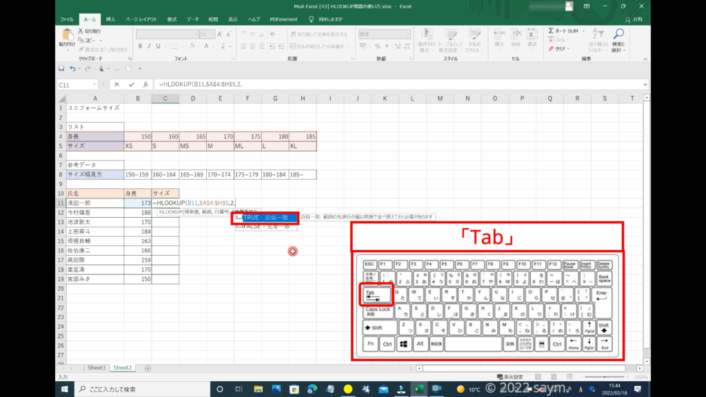 検索方法は、近似一致にしたいので、「TRUE」を選択し、「Tab」を押します。