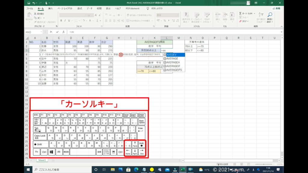 「AVERAGEIFS」と入力します。もしくは、「AV」と入力するとAVERAGE関係の関数が表示せれます。青くなっている所が現在選択されている関数なので、キーボードのカーソルキー、矢印キーとも言いますが、下矢印を押して「AVERAGEIFS」の所まで移動させます。「AVERAGEIFS」が青くなっていればOKです。