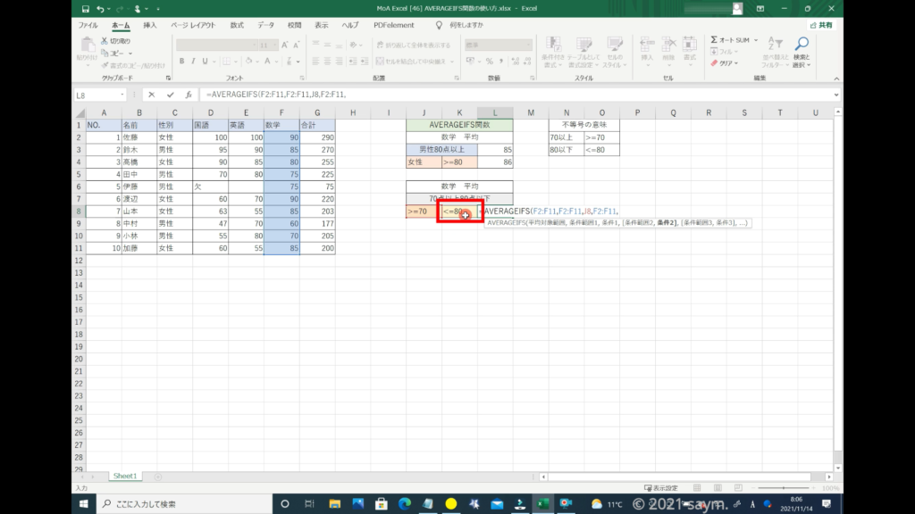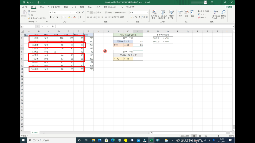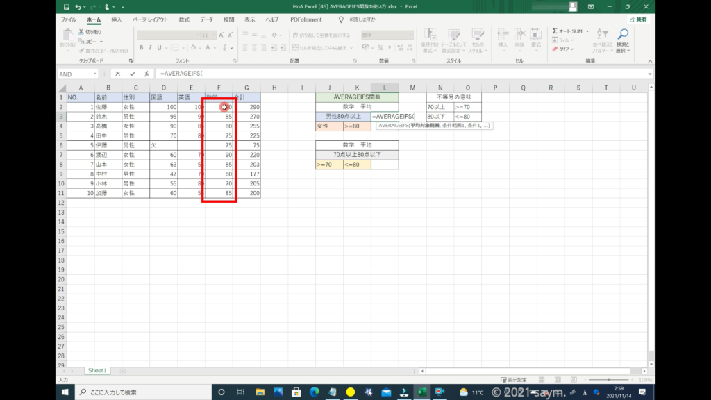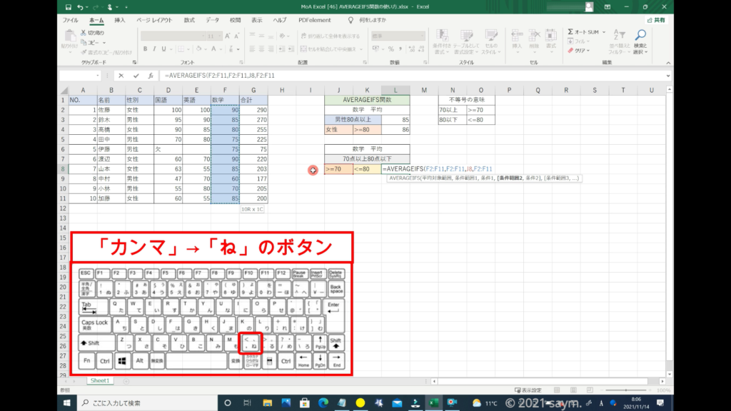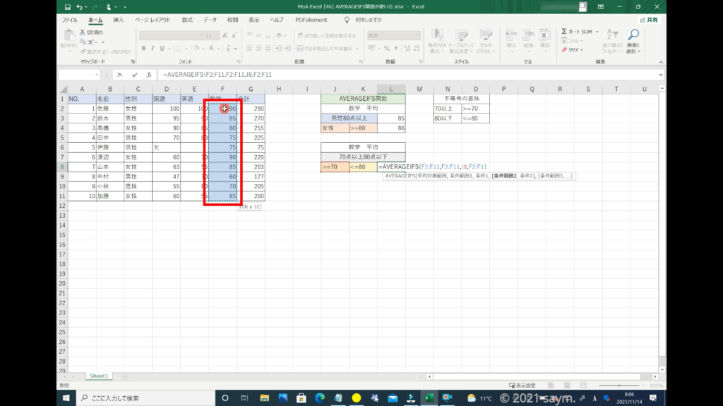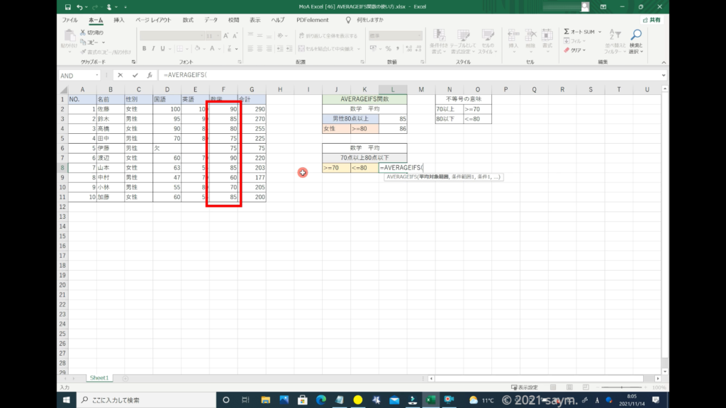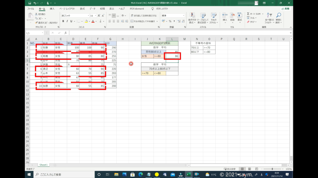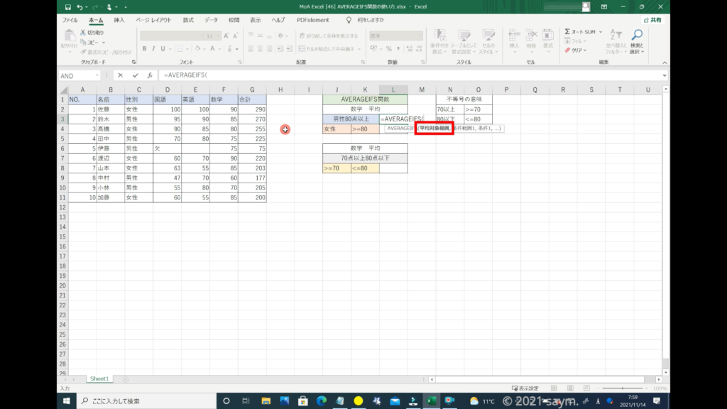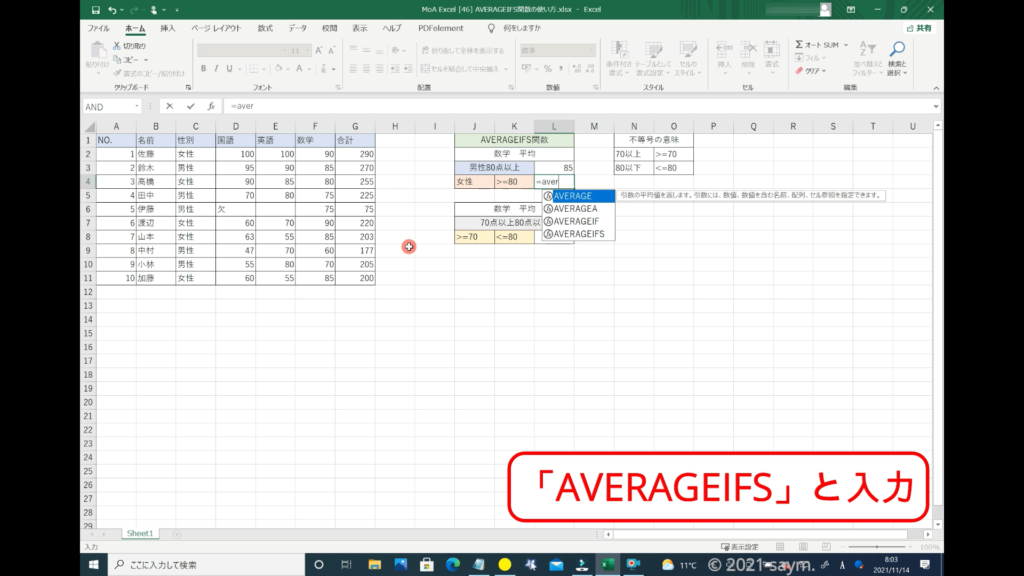 Excel AVERAGEIFS関数/指定した複数の範囲内の中で、それぞれ個別に指定した 全ての条件を満たす値の平均値を返す関数の使い方 動画