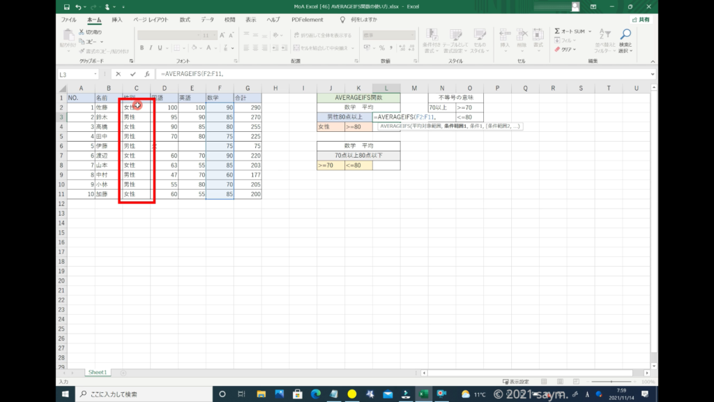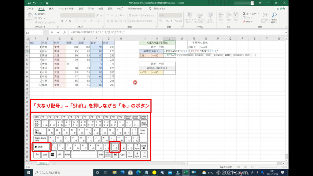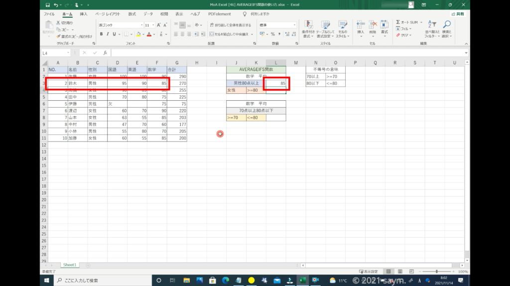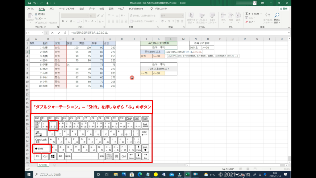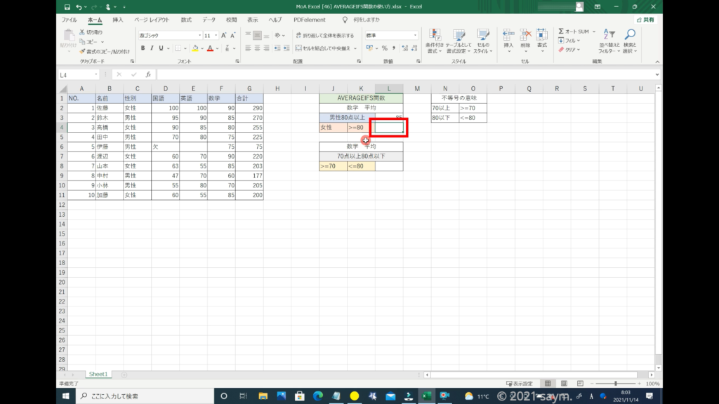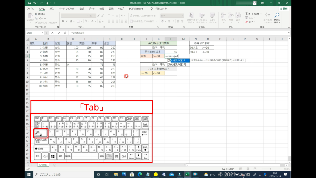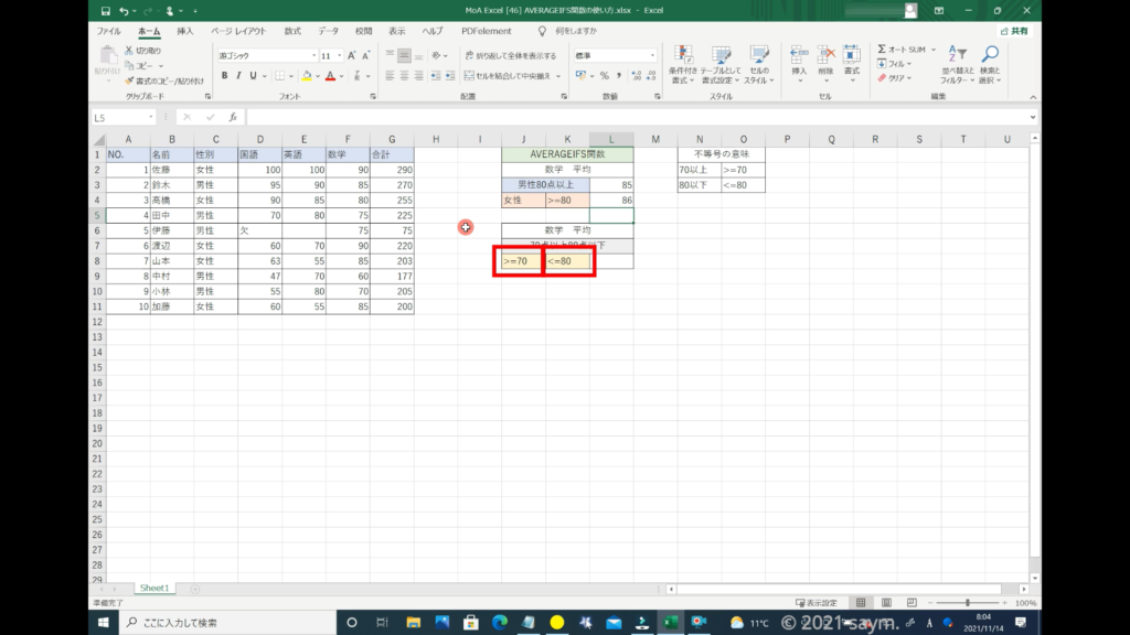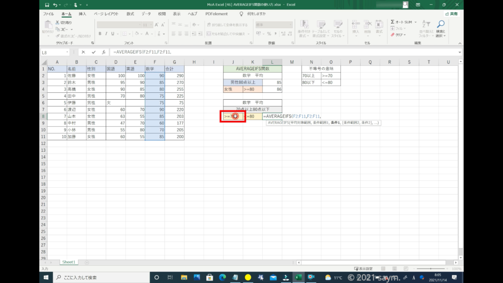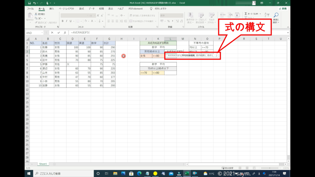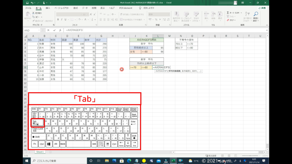 Excel AVERAGEIFS関数/指定した複数の範囲内の中で、それぞれ個別に指定した 全ての条件を満たす値の平均値を返す関数の使い方 動画