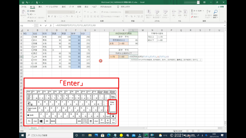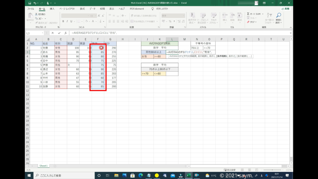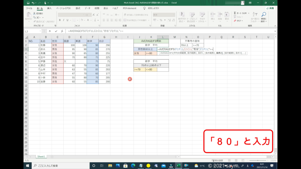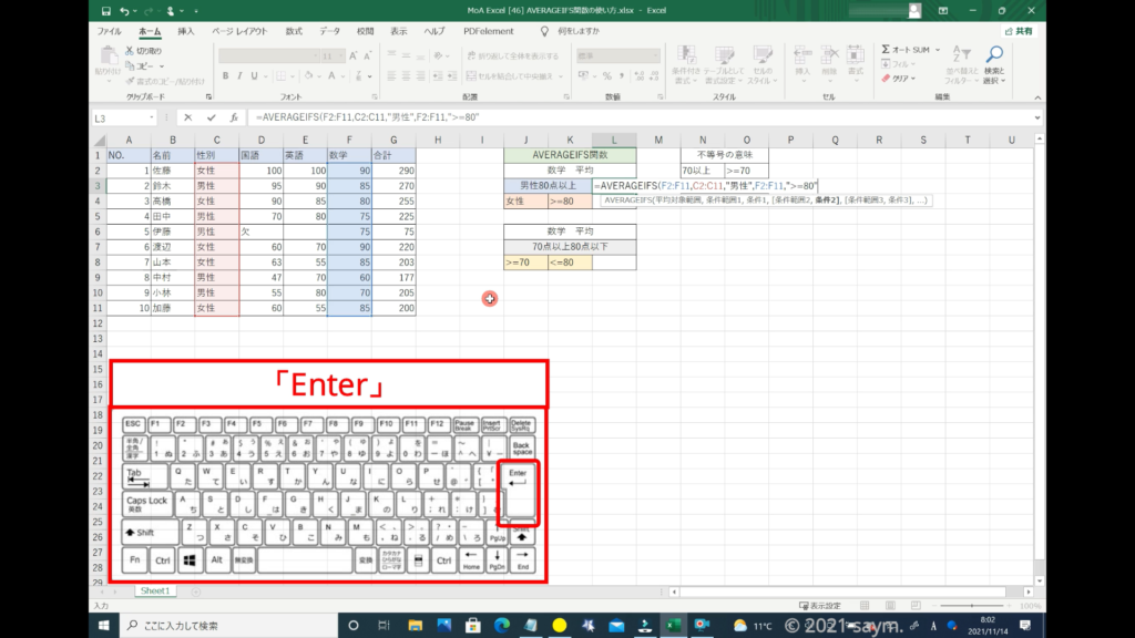これで、数学の点数から男性の80点以上を取った人の平均を出す式ができましたので、「Enter」で閉じます。