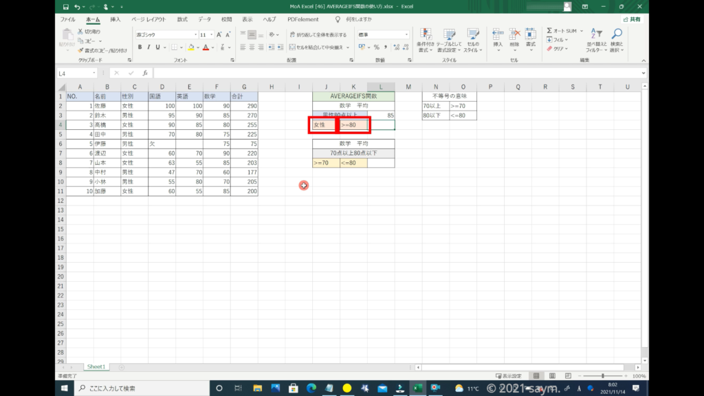 今度は、女性の80点以上を取った方の平均を出していきます。ですが、先程は条件を直接入力し、式を作っていきましたが、今回は予め、リストに女性と80点以上という条件を、別々のセルに分けて入力しておきます。80点以上は、普通に80点以上と書いてしまうとエラーを起こすので、