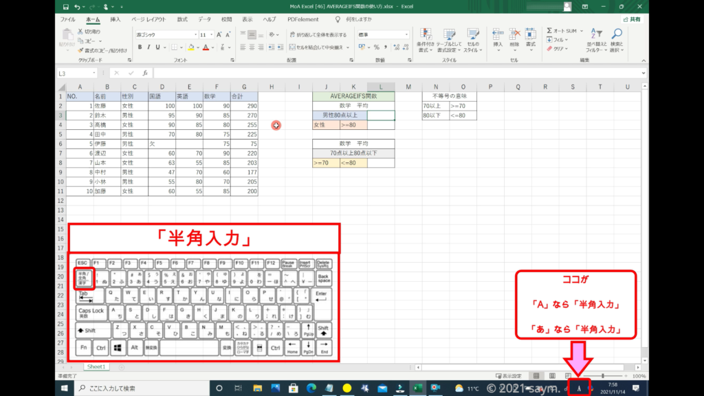 関数を入力する時は、半角入力ですので、半角入力になっているかを確認します。
