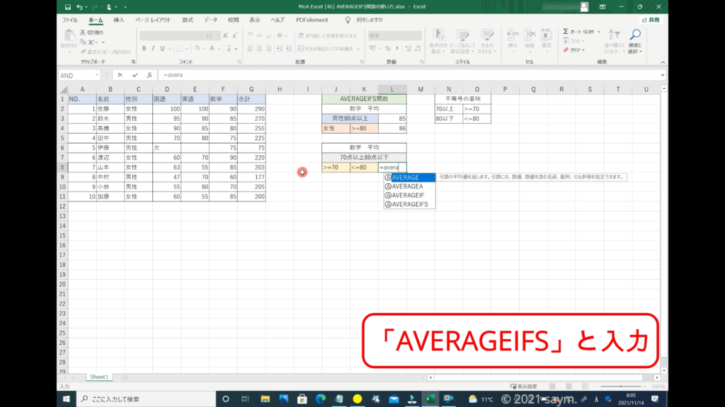 「AVERAGEIFS」と入力します。