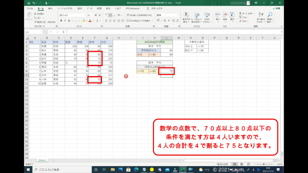 続いて今度は、数学の点数で70点以上80点以下の方の合計の平均点をだしていきたいと思います。