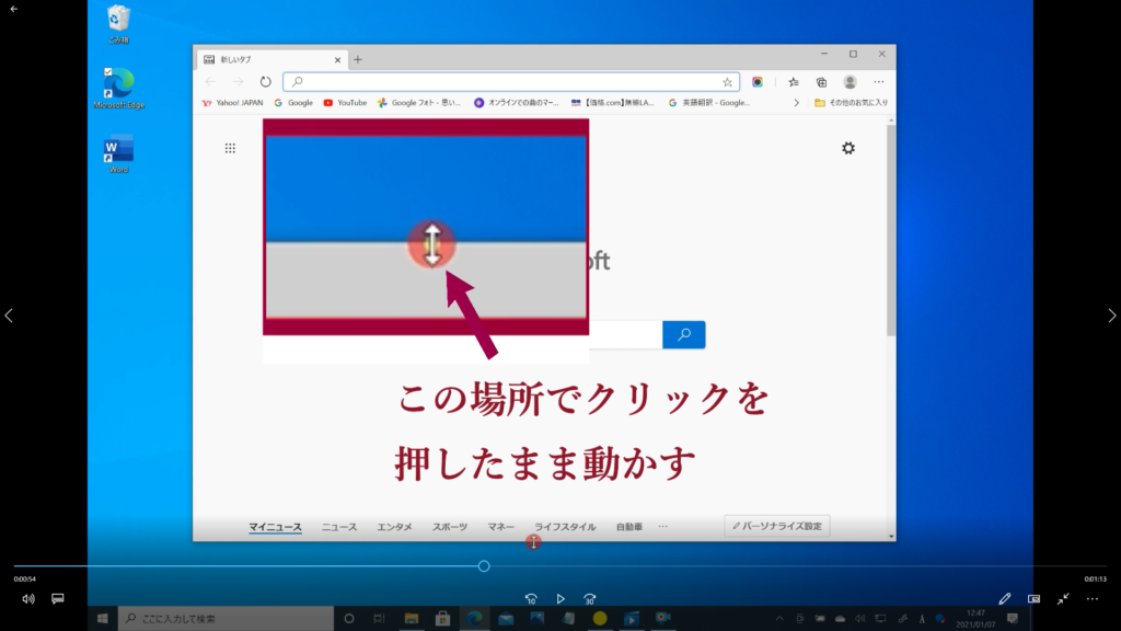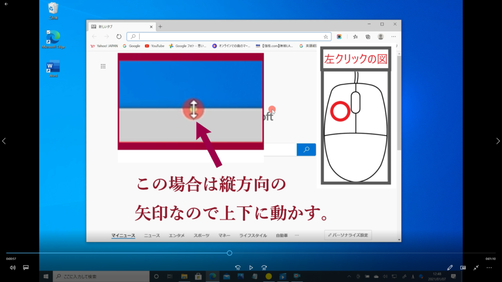 ↓手順① 下記の画像のように、マウスを画面の端に合わせると両方向の矢印が現れる。