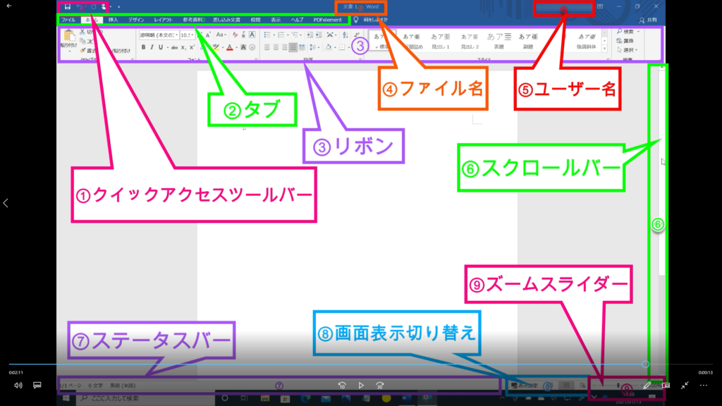 本記事では、Wordを始める方の為に、最初に覚えておいた方が良い、画面の名称を、約2分半の動画で説明しています。