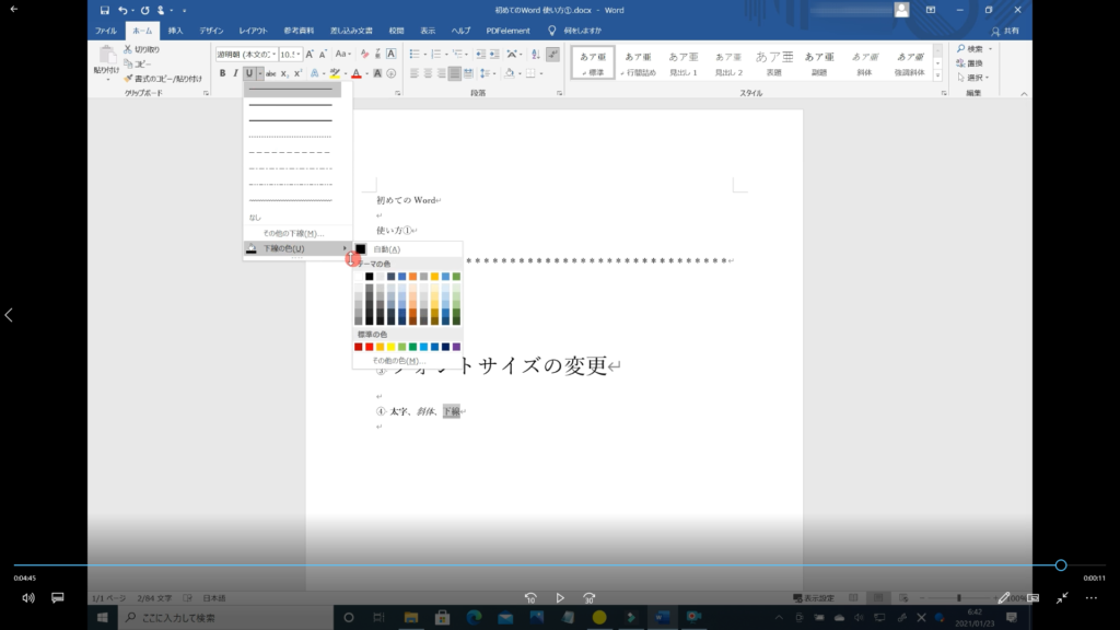 ↓手順⑩ 下線に色をつけたい時は、もう一度「U」の右、下向き三角形をクリックして一番下の「下線の色」にマウスを合わせると、様々な色がありますので、変えたい色にマウスを合わせクリックします。
