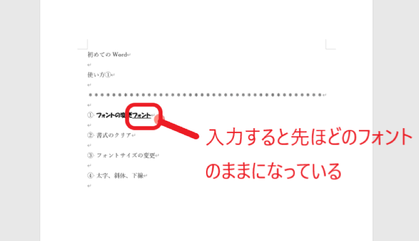 ↓手順① 先程、書式を変えた所から続けて文字を入力すると、変更したフォントのまま入力されるので、初期の字体に戻したい場合は直さないとなりません。「フォントの変更」のやり方で直しても良いのですが、もっと簡単に直すには手順②に進んでください。